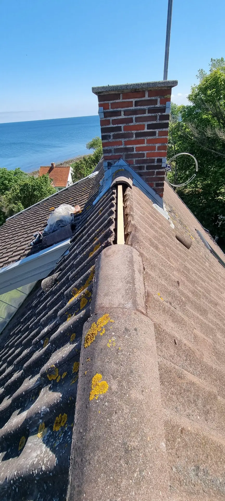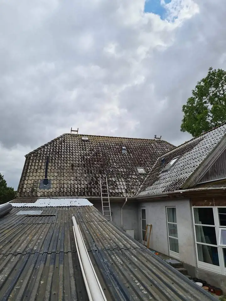 Vi fjerner skånsomt alger, mos og lav, der nedbryder taget og forkorter dets levetid. -